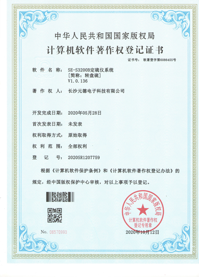 祝賀長沙元德電子科技有限公司獲得SE-S3200B定硫儀系統(tǒng)計算機軟件著作權登記證書