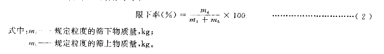 煤樣用孔徑與產品粒級下限相同的篩子過篩,用5.3條所述的相應的秤稱量全部篩上物和篩下物,稱準到1/1000,按式(2)計算限下率:
