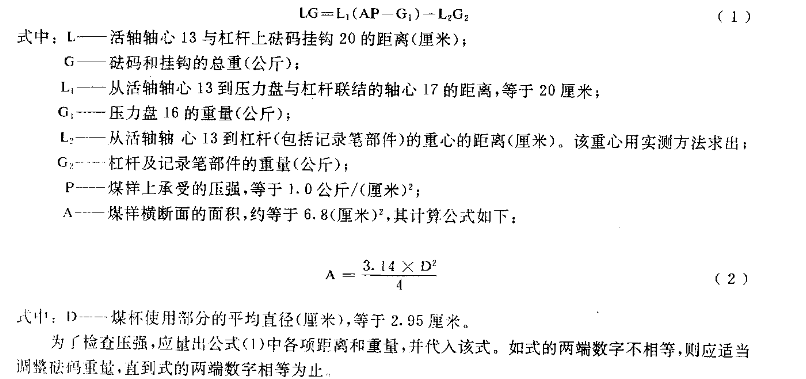 (2)帶平衡鉈的儀器,首先調節平衡鉈的位置,使其與帶壓力盤和記錄筆部件的杠桿平衡(兩邊力矩相等,杠桿成水平),再將平衡鉈固定。用下列公式檢查壓強: